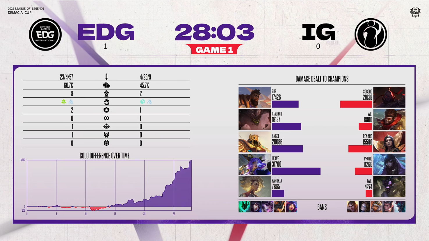 结果这一局比赛,EDG打出了单方面的碾压局。前15分钟,双方打得比较平稳,经济没有拉开。17分钟左右,EDG众人击杀Photic并推掉中路一塔;21分钟左右,EDG众人团战操作更优,打赢团战并拿下厄塔汗;22分钟左右,EDG团战再次碾压轻松取胜;最终28分03秒,EDG团灭IG,先赢一局!