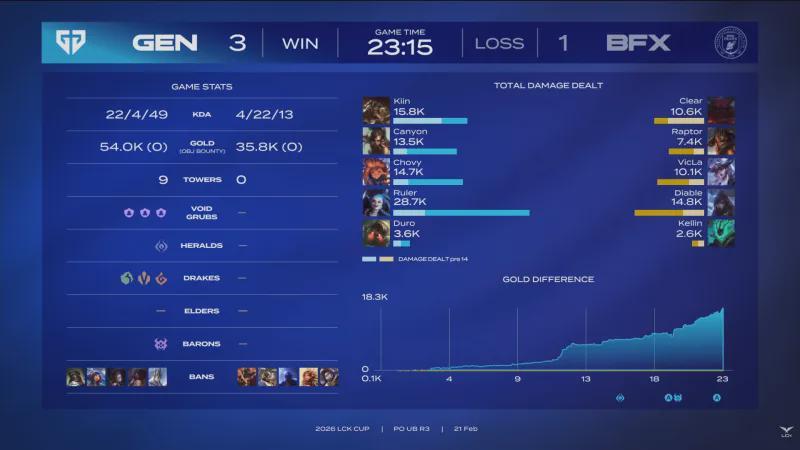第一局比赛,GEN蓝色方,禁用:妮蔻、芸阿娜、发条、伊泽瑞尔、希维尔,选用:Kiin雷克塞、Canyon蔚、Chovy岩雀、Ruler韦鲁斯、Duro洛;BFX红色方,禁用:兰博、巴德、格温、鳄鱼、泰坦,选用:Clear安蓓萨、Raptor潘森、VicLa沙皇、Diable烬、Kellin波比