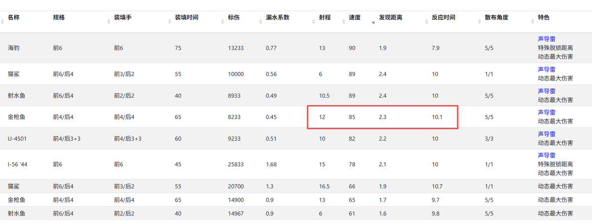 除去独特的空袭机制,金枪鱼的本体性能在十级潜艇里也基本合格。它一共有两种鱼雷,较为重要的一款是替代射击的声导雷。拥有12km射程和85节的高航速,可以让金枪鱼比较安逸的输出。